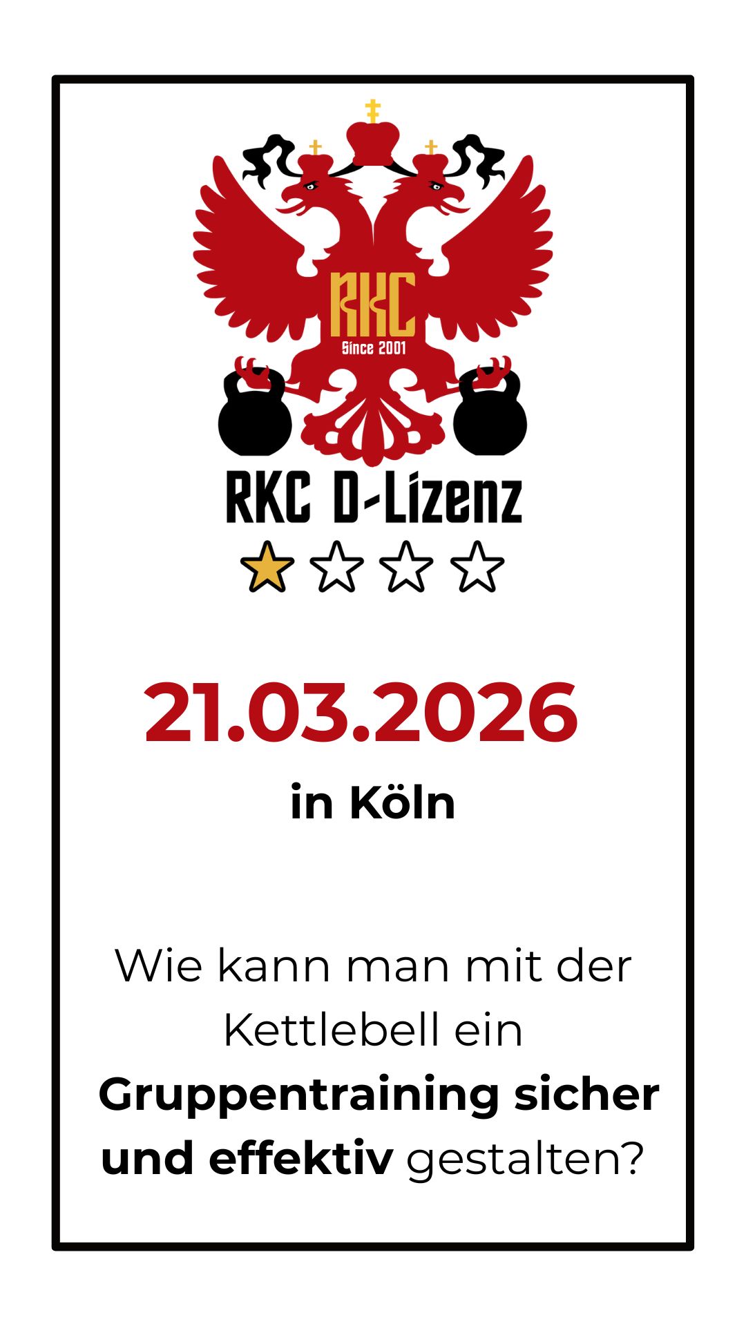 Was ist neu? Es gibt mit der RKC D-Lizenz eine neue Einstiegsstufe. Auch wenn du nicht als Kurs Instruktor arbeitest, bringt dir dieses Wissen die Basis im Umgang mit der Kettlebell. Jede weitere RKC Zertifizierung baut aufeinander auf. Jede Technik- und Kraftprüfung wird im Vorfeld gelehrt und es gibt Trainingspläne, um die hohen Testanforderungen bestehen zu können.